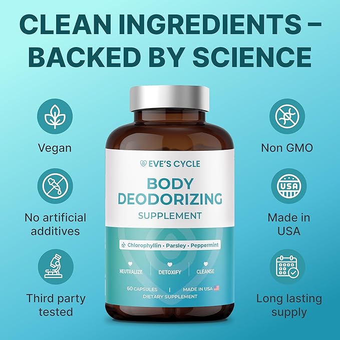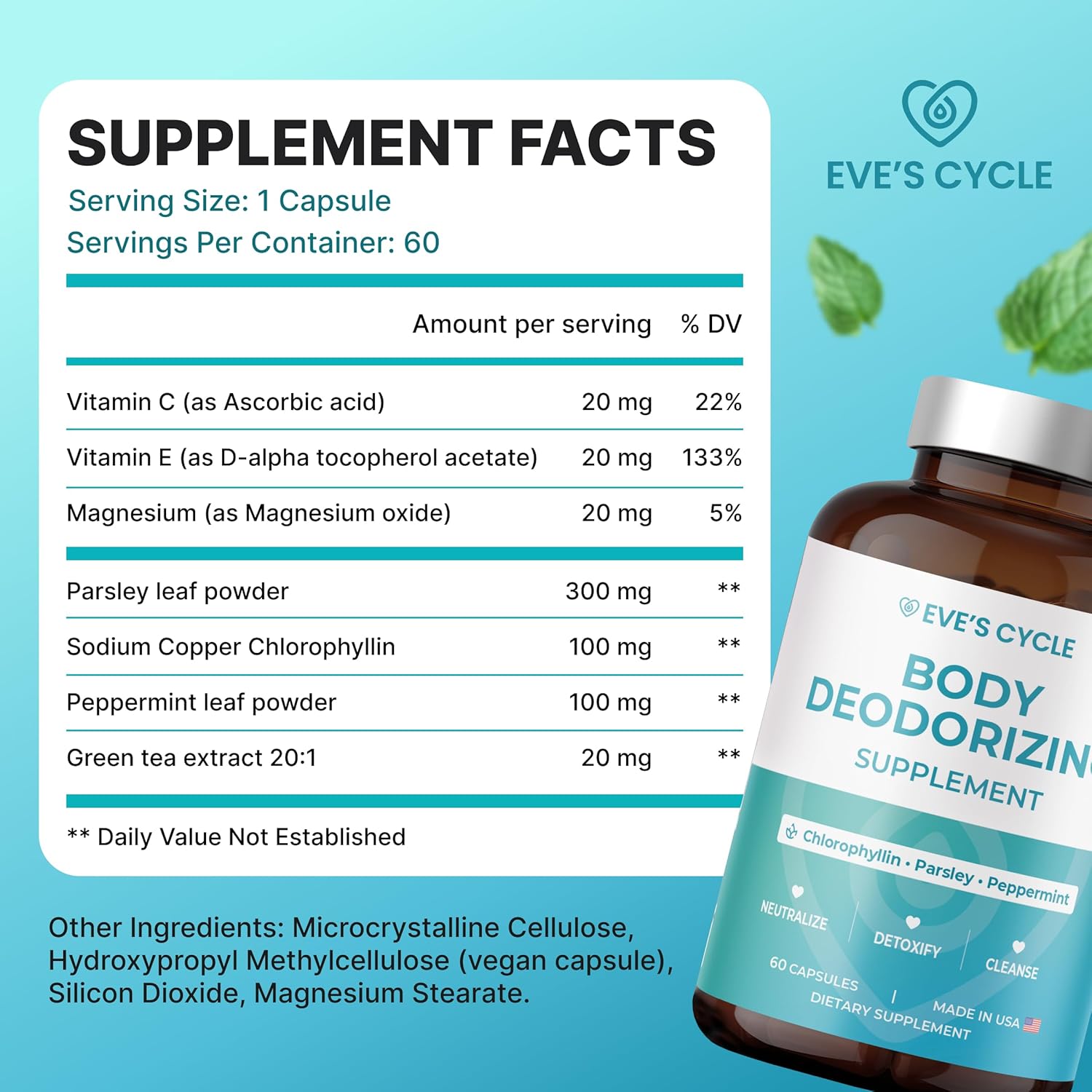 FINALLY, DEODORANT THAT DOESN'T GHOST YOU AT 2PM: Our body odor supplement works from the inside out with 500mg+ of Chlorophyllin, Parsley & Peppermint. Because external deodorant is great until it's not.