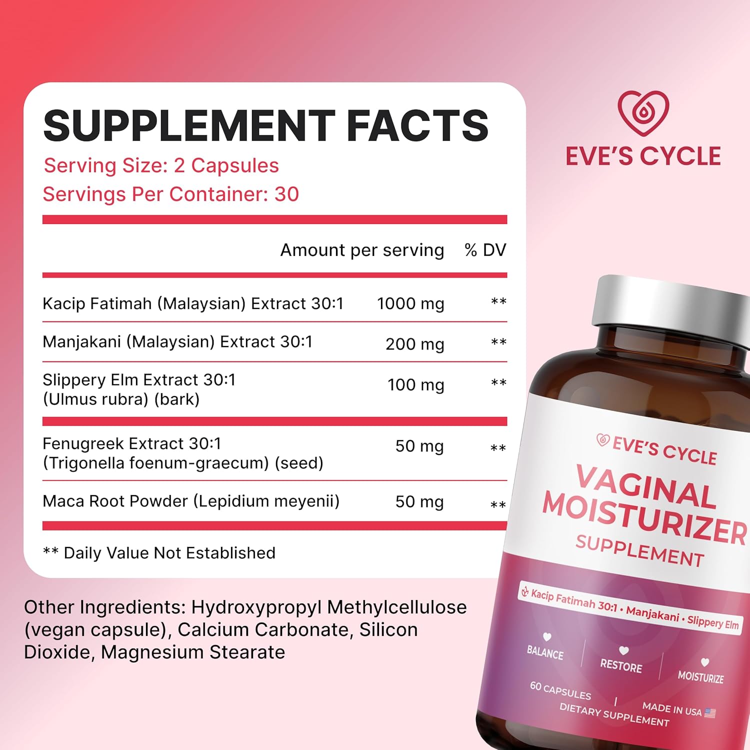 LET'S NORMALIZE THIS - VAGINAL DRYNESS IS REAL: Most women experience intimate dryness at some point - hormones, stress, life changes, it happens. Our formula with Kacip Fatimah, Manjakani, and Slippery Elm works from within so you can stop worrying about uncomfortable moments and start living comfortably.